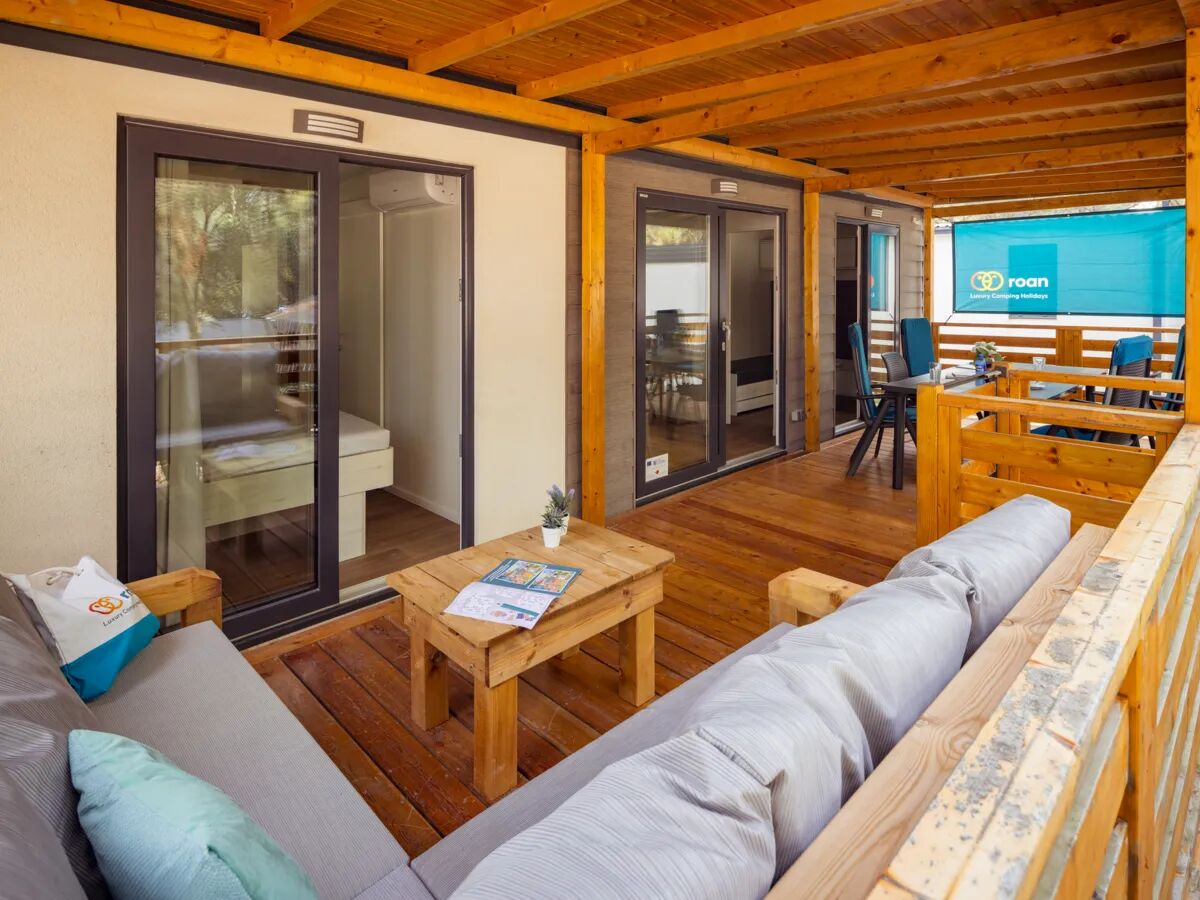 The decking is fully covered and no less than 24 m2. With the Roan sunbanner you can always create shade under the porch, here you will also find a luxurious garden set. On the other side of the decking is a beautiful lounge sofa with large comfortable cushions and a side table. On the campsite page, you can read which free barbecue/grill plate your accommodation has.