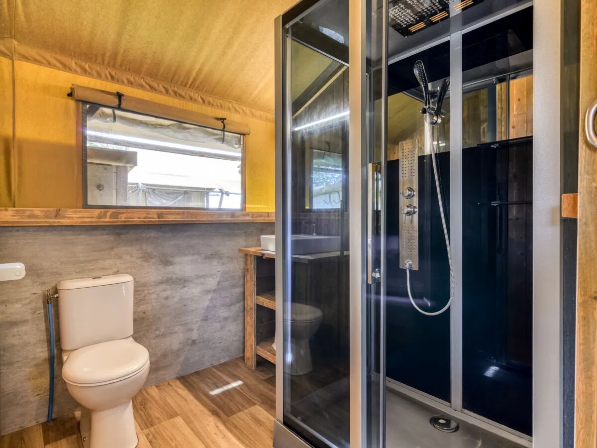 The robust wooden kitchen has lockable kitchen cabinets, topped with a beautiful plastic work surface. The worktop also includes a sink and a 4-burner gas stove. The kitchen comes complete with a large fridge and separate freezer compartment. There is also a heater for cooler days! The living room includes a dining table with 6 chairs. This type of lodge tent comes with a fully fitted bathroom with luxury shower, toilet and washbasin.