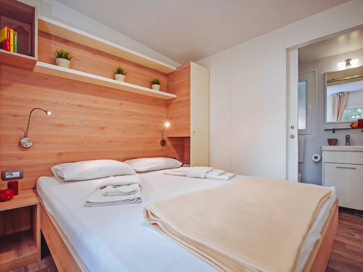 The Premium mobile home has 2 bedrooms: one with a double bed and the children's bedroom has 2 single beds. The sofa in the living room can also be converted into a bed. One bed rack is provided as standard, which you can slide under the mattress to prevent your toddler from rolling out of bed.