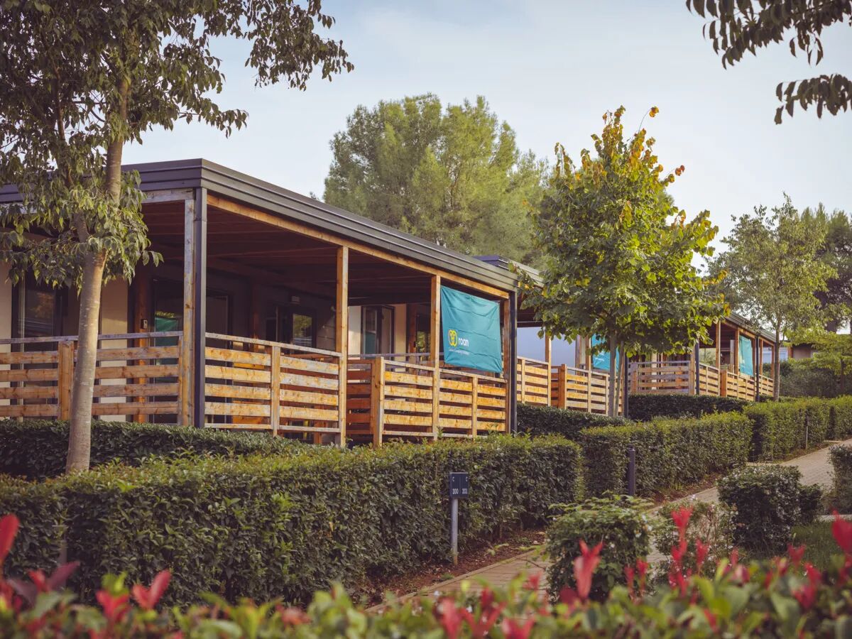 The wooden decking is covered and no less than 24 m2. The luxurious garden set consists of four adjustable chairs with cushions and two bucket seats. On the other side of the decking is a lovely lounge sofa with large comfortable cushions. With the Roan sunbanner you can always create shade under the canopy. On the campsite page, you can read which free barbecue/grill plate your accommodation has.