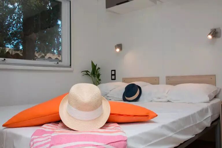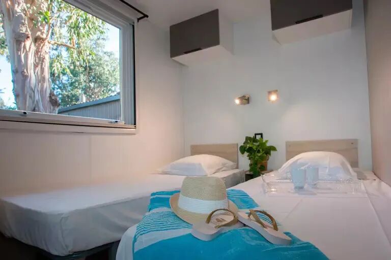This luxury mobile home features 3 bedrooms for maximum sleeping comfort! The master bedroom has a large double bed measuring 1.60 x 2.00m. The second and third bedrooms have 2 single beds. One bed rack is standard, which you can slide under the mattress to prevent your toddler from rolling out of bed. In the living room, one person can also sleep on the sofa if necessary.