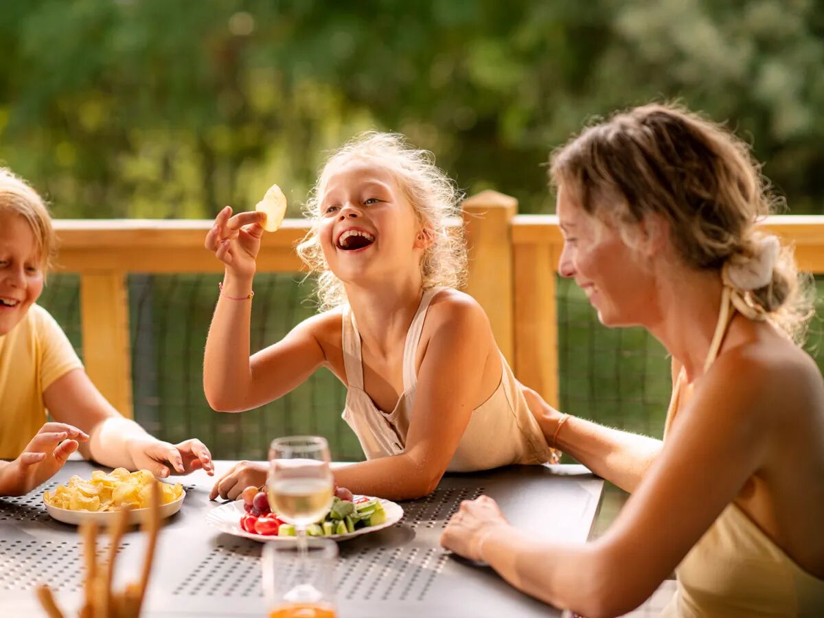 The semi-covered decking is no less than 15 m2 and equipped with a luxurious garden set. The garden set consists of 4 adjustable chairs, 2 bucket seats and 2 comfortable loungers. On the campsite page you can read which free barbecue/grill your accommodation has.