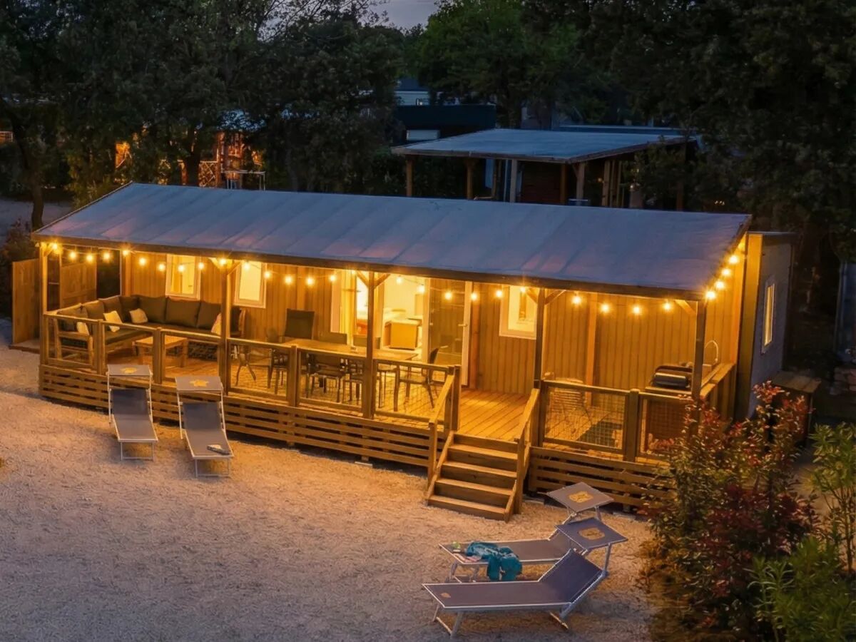 Aircon SAT-TV Decking Decking fence Lounge sofa Dishwasher Final Cleaning Beds made Outdoor kitchen 2 bathrooms Premium Zone New WiFi Ambient string lighting on deckingThe newest, largest and most luxurious mobile home in our range! It will give your camping holiday a whole new dimension. You won't find a more luxurious mobile home on the current market! The Supreme Deluxe Lounge can accommodate up to 8 people and has 4 bedrooms and 2 bathrooms. On the spacious decking you will find a large lounge sofa perfect to relax on. Did you know that this accommodation even has an outdoor kitchen and includes WiFi, bed linen, towels and final cleaning?