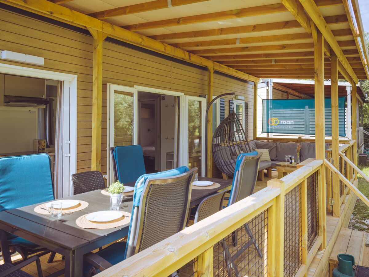 The extra large 24 m2 decking has a lounge and dining area. The decking is completely covered and you can dine at the extra long table under the roof. The lounge sofa is on the other side of the decking. For relaxation, there are 2 sun loungers and for even more comfort, this year we have added 2 reclining chairs, which you can use in the mobile home itself or take to the pool and beach. On the decking you will also find a lovely hanging chair and a luxurious XL grill. On the campsite page, you can read which free barbecue/grill plate your accommodation has. Finally, we take all the work off your hands: final cleaning is of course included in this luxury mobile home.